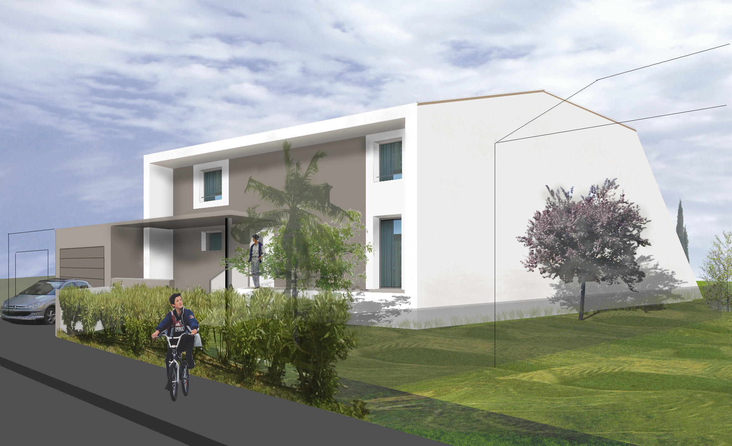 Située dans un grand lotissement dense, les pignons protègent la famille nombreuse des vis à vis à venir. L'économie était le maître mot : travée structurelle de 5m maximum, gaines techniques pour tous réseaux regroupées, matèriaux optimum.